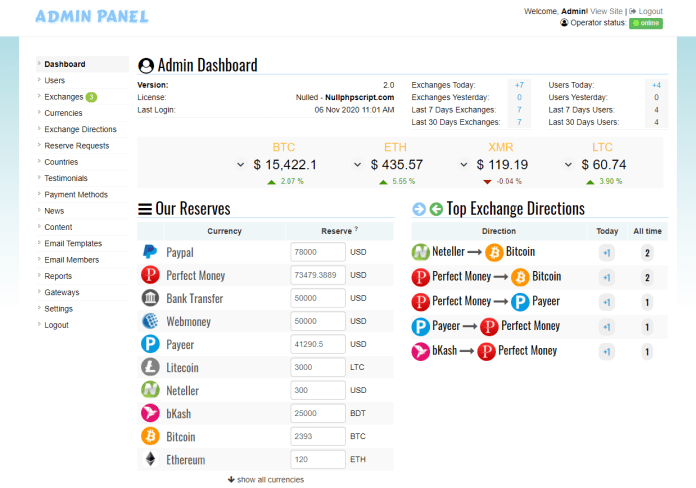 Buy Now Advanced Money Exchange Script and Run your own e-Currency Exchange Business in Minutes. Powerful PHP Script which will Allow you to Run Bitcoin or other Money and Cryptocurrencies Exchanger Website.